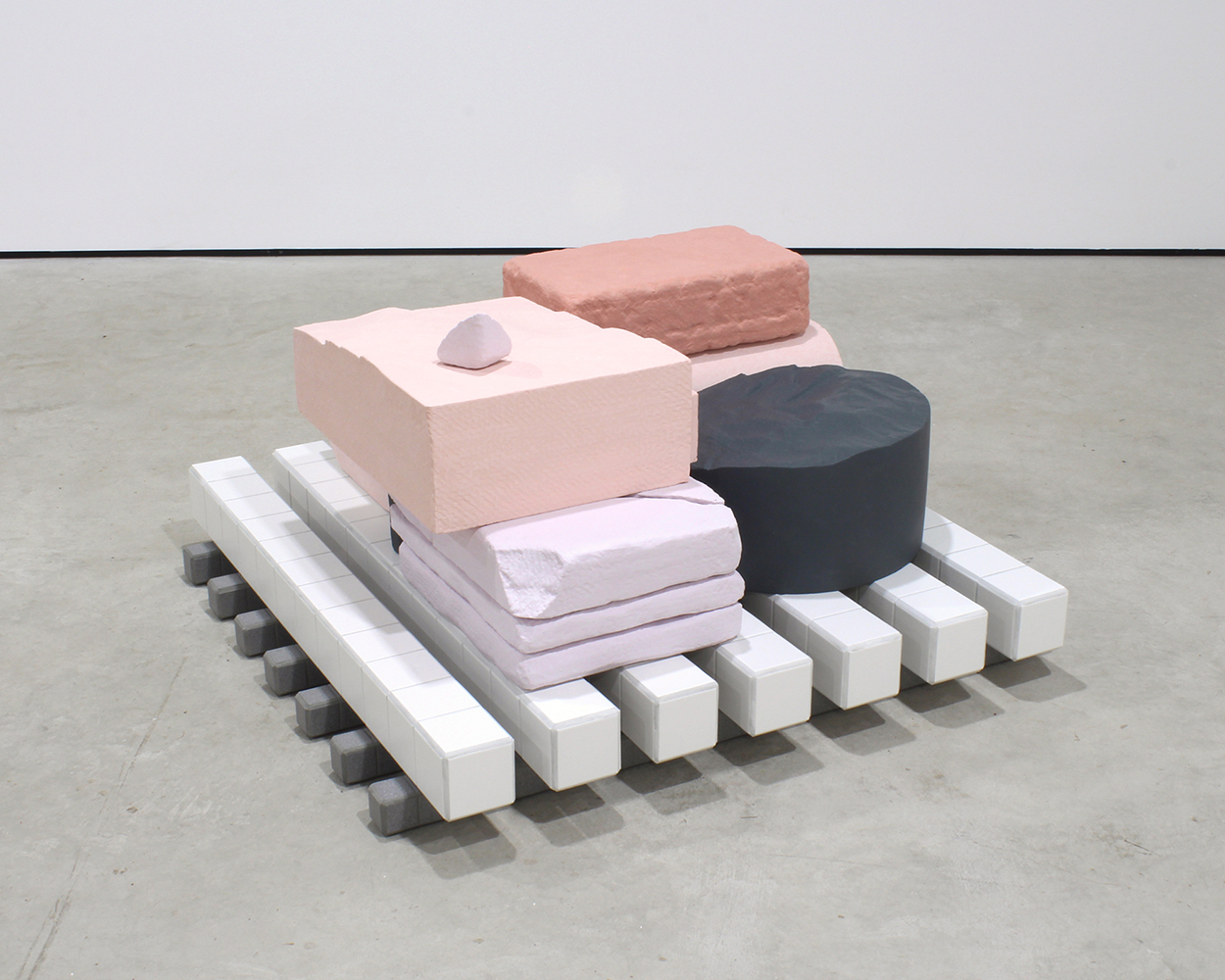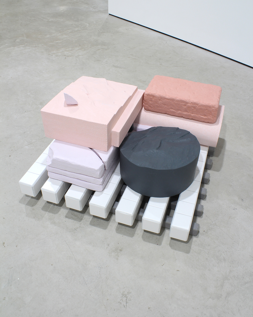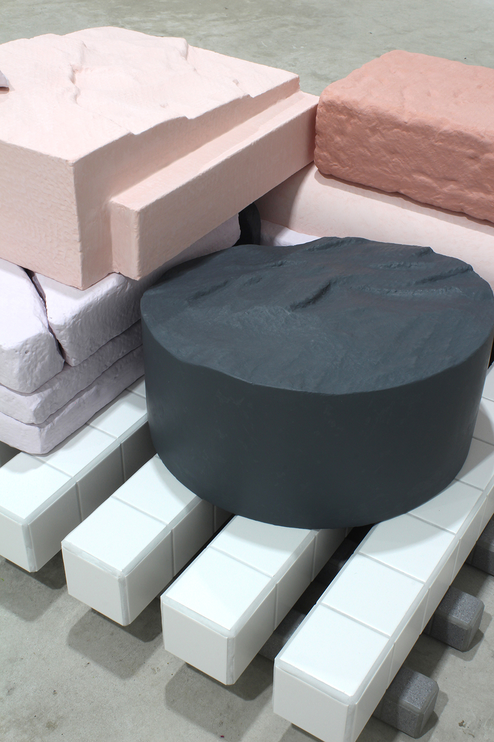 MDF, softwood, polystyrene, fibreglass matting, pigmented Jesmonite, ceramic tiles and grout.